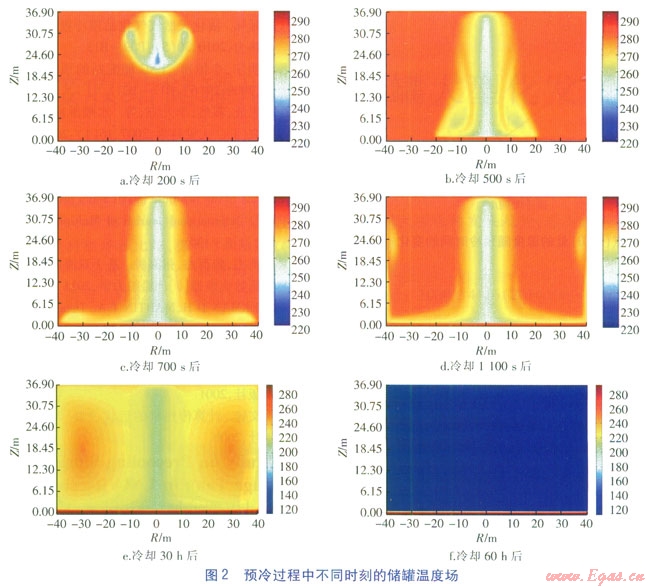 計算儲罐溫度場隨著時間的變化,儲罐溫度降至-150℃左右計算終止。預(yù)冷過程中不同時刻的儲罐溫度場見圖2,圖2中溫度單位均為K。