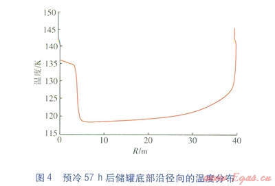 點(0,0)處的溫度隨預(yù)冷時間的變化見圖3,預(yù)冷57h后儲罐底部沿徑向的溫度分布見圖4。從圖3可以看出,儲罐底部中心(即點(0,0)處)的溫度并不是隨著預(yù)冷過程的進(jìn)行而一直降低的,當(dāng)儲罐底部溫度降低到一定程度后,底部中心出現(xiàn)了溫度不降反升的現(xiàn)象。從圖4也可以看出,底部中心區(qū)域的溫度高于其他位置(除靠近側(cè)壁處)。這是因為噴淋的液滴到達(dá)儲罐底面后,在底面氣化,產(chǎn)生的氣體無法及時沿底面向四周擴散,積聚在儲罐底部的中心區(qū)域,形成二次回流,二次回流阻礙了儲罐底面與內(nèi)部低溫氣體的對流換熱。同時,底部的混凝土向內(nèi)部的導(dǎo)熱還在繼續(xù),因此在二次回流區(qū)出現(xiàn)了溫度不降反升的現(xiàn)象。隨著預(yù)冷的繼續(xù),底部混凝土的熱量充分釋放,液滴在儲罐底面處的氣化量減小,產(chǎn)生的新氣體量減少,二次回流區(qū)逐漸被壓縮,底部中心區(qū)域的溫度又重新下降。