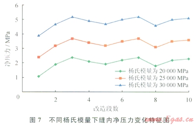 為進(jìn)一步研究?jī)?chǔ)層巖石力學(xué)參數(shù)對(duì)應(yīng)力陰影的影響,設(shè)置不同泊松比和楊氏模量進(jìn)行研究??疾觳此?span lang="EN-US">0.2、0.35、0.45比時(shí),結(jié)果表明泊松比對(duì)應(yīng)力陰影的影響較小,即便在泊松比為0.5的極端情況下,導(dǎo)致的凈壓力變化幅度仍不大,因此產(chǎn)生的應(yīng)力影響很小(圖6)??疾鞐钍夏A?span lang="EN-US">20000MPa、25000MPa、30000MPa等3種情況,研究表明:楊氏模量對(duì)裂縫內(nèi)凈壓力值的變化影響較大,產(chǎn)生的應(yīng)力陰影現(xiàn)象越強(qiáng)烈,楊氏模量越高對(duì)裂縫應(yīng)力陰影效果影響也較大(圖7)。因此,儲(chǔ)層巖石力學(xué)參數(shù)中楊氏模量對(duì)應(yīng)力陰影現(xiàn)象的影響最敏感。