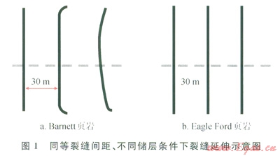 隨著工具設(shè)備及水平井改造技術(shù)的不斷進(jìn)步,儲(chǔ)層多段改造的規(guī)模、段數(shù)等越來(lái)越多[8-9]。水力壓裂沒(méi)計(jì)師可利用分簇射孔將分段改造距離設(shè)置得越來(lái)越近,但往往過(guò)多的分簇與分段未必就帶來(lái)理想的效果,Roussel認(rèn)為應(yīng)力陰影效應(yīng)的產(chǎn)生機(jī)理主要在于支撐劑的填充導(dǎo)致人工裂縫附近引起了應(yīng)力場(chǎng)的變化,蔣廷學(xué)等也在研究我國(guó)頁(yè)巖氣壓裂設(shè)計(jì)中指出,壓裂在單一裂縫脆弱面上產(chǎn)生誘導(dǎo)應(yīng)力的存在,并指出產(chǎn)生應(yīng)力陰影的誘導(dǎo)應(yīng)力可以改變最大與最小主應(yīng)力的分布,使裂縫發(fā)生轉(zhuǎn)向[10]。述研究表明,應(yīng)力陰影效應(yīng)可引起人工裂縫從水平井的橫切縫中開(kāi)始偏離朝向或遠(yuǎn)離以前的裂縫方向延伸,使得下一裂縫發(fā)生轉(zhuǎn)向。Barnctt頁(yè)巖裂縫間距30m時(shí)水平井壓裂裂縫產(chǎn)生的應(yīng)力陰影效應(yīng)如圖1-a所示,可見(jiàn)從第二條裂縫開(kāi)始裂縫出現(xiàn)了與主縫向切的裂縫系統(tǒng),而Eagle Ford頁(yè)巖壓裂的裂縫監(jiān)測(cè)情況,同樣是30m的裂縫間距沒(méi)有出現(xiàn)裂縫應(yīng)力陰影效應(yīng)(圖1-b)。因此研究陰影效應(yīng)的產(chǎn)生機(jī)理,建立分析數(shù)學(xué)模型并進(jìn)行其影響因素分析對(duì)水平井分段體積改造優(yōu)化設(shè)計(jì)及效果的提升具有重要研究與應(yīng)用價(jià)值。