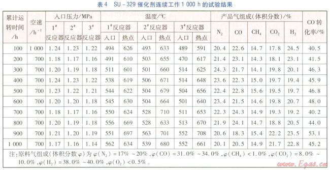 1#反應器入口壓力為1.15~1.25MPa,1#反應器入口溫度為490~560℃,原料氣中CO體積分數(shù)為31%~34%的穩(wěn)定運轉(zhuǎn)條件下,SU-329催化劑原料氣的低熱值比為1.17左右,產(chǎn)品氣的低熱值為 連續(xù)工作1000h的試驗結(jié)果見表4。