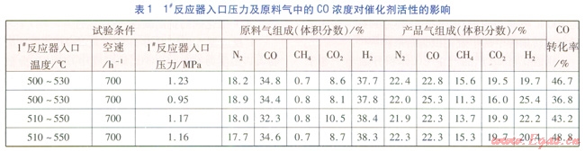 1#反應器入口壓力及原料氣中CO的濃度均有一定波動,會影響催化劑的活性,對此進行了試驗,試驗條件及結(jié)果見表1。