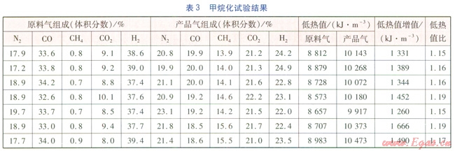 由表3可知,產(chǎn)品氣中CO體積分數(shù)小于等于20%,CH4體積分數(shù)為13.9%~15.6%,產(chǎn)品氣與10000kJ/m3左右,增值達1400kJ/m3左右。