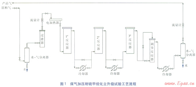 煤氣加壓耐硫甲烷化立升級試驗的工藝流程見圖1。原料氣直接從煤氣生產(chǎn)系統(tǒng)中引取,原料氣中H2S含量為40~60mg/L,總硫含量約為250~300mg/L。原料氣(冷煤氣)依次通過水—氣分離器(分離掉水分)和過濾器,經(jīng)流量計計量后,經(jīng)電加熱器加熱后進入1#反應器參加反應。從1#反應器出來的熱煤氣可直接進入2#反應器參加反應,當催化劑床層熱點溫度大于650℃時,從1#反應器出來的熱煤氣經(jīng)冷卻器冷卻后再進入2#反應器參加反應。從2#反應器出來的熱煤氣可直接進入3#反應器參加反應,當催化劑床層熱點溫度大于650℃時,從2#反應器出來的熱煤氣經(jīng)冷卻器冷卻后再進入3#反應器參加反應。從3#反應器出來的熱煤氣進入調(diào)節(jié)反應器(如果催化劑性能尚可,則從3#反應器出來的熱煤氣從頂部進入調(diào)節(jié)反應器,隨即離開,不參加反應;如果催化劑性能不好,則從3#反應器出來的熱煤氣從下部進入調(diào)節(jié)反應器,熱煤氣參加反應),從調(diào)節(jié)反應器出來的熱煤氣經(jīng)過冷卻器后進入水—氣分離器,經(jīng)水—氣分離器分離掉水分后,再經(jīng)流量計計量得到產(chǎn)品氣。