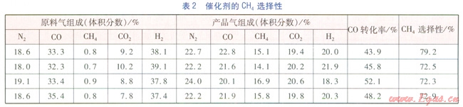 由表l可知,當原料氣中CO濃度基本相同時,在1#反應器入口溫度相同的條件下,隨著1#反應器入口壓力的降低,產(chǎn)品氣中的CH4含量和CO轉(zhuǎn)化率下降明顯,這說明催化劑活性對壓力變化很敏感。當1#反應器人口壓力幾乎不變時,在1#反應器入口溫度相同的條件下,隨著原料氣中CO濃度的降低,產(chǎn)品氣中的CH4含量和CO轉(zhuǎn)化率也隨之下降。