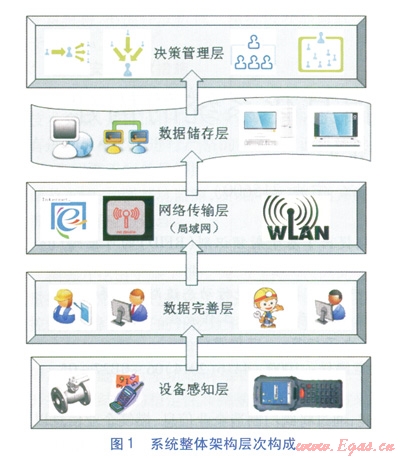RFID可控閥門信息化系統(tǒng)整體架構(gòu)由設(shè)備感知層、數(shù)據(jù)完善層、網(wǎng)絡(luò)傳輸層、數(shù)據(jù)儲(chǔ)存層、決策管理層共5個(gè)層次構(gòu)成,系統(tǒng)整體架構(gòu)層次構(gòu)成見圖1。