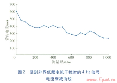 一般情況下,管道內(nèi)的信號(hào)電流應(yīng)該隨著測(cè)量距離的增大而不斷衰減,但是當(dāng)存在外界低頻電流干擾時(shí),4Hz的信號(hào)電流會(huì)出現(xiàn)突然反彈或者波動(dòng)的現(xiàn)象,受到外界低頻電流干擾時(shí)的4Hz信號(hào)電流衰減曲線見圖2[6]。外界干擾的低頻電流會(huì)與檢測(cè)中使用的4Hz低頻信號(hào)電流互相作用,產(chǎn)生疊加或抵消,當(dāng)疊加時(shí),會(huì)出現(xiàn)圖2中信號(hào)電流反彈升高的情況;當(dāng)?shù)窒麜r(shí),會(huì)出現(xiàn)信號(hào)電流驟然變小的情況。無論是疊加還是抵消,都會(huì)對(duì)防腐層的檢測(cè)結(jié)果產(chǎn)生很大影響,甚至嚴(yán)重失真。
