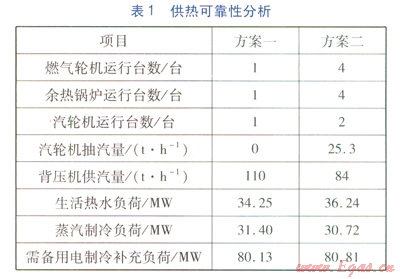 考慮到最惡劣條件下,方案一中抽凝式汽輪機系統(tǒng)發(fā)生事故,方案二中有1套抽凝式汽輪機系統(tǒng)發(fā)生事故,兩個方案供熱可靠性分析見表1。