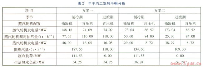 兩種裝機方案的機組年平均工況熱平衡分析見表2。由表2可知,兩種方案在制冷期和過渡期均能滿足負(fù)荷需求。兩種裝機方案的全廠熱經(jīng)濟性指標(biāo)見表3。