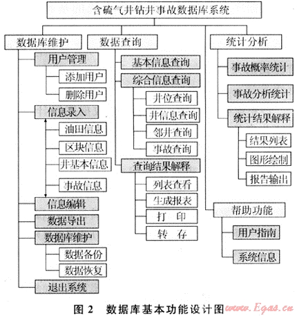 鉆井事故數(shù)據(jù)庫系統(tǒng)主要有如下5大功能模塊:①數(shù)據(jù)管理:完整的數(shù)據(jù)錄入、編輯、刪除等操作。數(shù)據(jù)庫管理設(shè)計的關(guān)鍵問題是如何避免記錄重復(fù)添加、規(guī)范數(shù)據(jù)的輸入格式以及一定的容錯性。a.避免記錄重復(fù),新數(shù)據(jù)與數(shù)據(jù)庫內(nèi)原有記錄不能完全相同。若新輸入的數(shù)據(jù)在數(shù)據(jù)庫中已存在給出提示。b.數(shù)據(jù)庫格式規(guī)范化,數(shù)據(jù)庫對于所輸入的數(shù)據(jù)必須經(jīng)過一定的后臺處理后,才能存儲到數(shù)據(jù)庫文件中。為了保證數(shù)據(jù)存儲的準(zhǔn)確性,該數(shù)據(jù)庫系統(tǒng)對所輸入數(shù)據(jù)的格式進(jìn)行了規(guī)定。c.容錯性,若對每一個數(shù)據(jù)項都進(jìn)行嚴(yán)格的規(guī)定,這無疑會引起數(shù)據(jù)錄入人員的反感,對數(shù)據(jù)錄入人員的技術(shù)水平也提出更高的要求,有些字段沒有必要進(jìn)行嚴(yán)格的格式限制。因此,充分利用Visual Basic內(nèi)部的字符轉(zhuǎn)化程序,有些字段沒有進(jìn)行格式限制,從而保證系統(tǒng)有一定的容錯性。d.數(shù)據(jù)的完整性,在數(shù)據(jù)編輯過程中所要考慮的首要問題是數(shù)據(jù)庫采用關(guān)系型數(shù)據(jù)庫,同一字段會在多個表中出現(xiàn),在數(shù)據(jù)的修改、刪除操作時,須保證數(shù)據(jù)庫的整體完整性。②數(shù)據(jù)庫備份與恢復(fù):對現(xiàn)有的數(shù)據(jù)庫內(nèi)數(shù)據(jù)定期進(jìn)行數(shù)據(jù)備份,防止由于系統(tǒng)問題或誤操作造成的數(shù)據(jù)丟失。a.備份文件名稱命名規(guī)則“database”+“備份的日期”(例如2008年5月29日備份的文件名:database20080529.mdb)。b.系統(tǒng)恢復(fù)功能,當(dāng)數(shù)據(jù)庫內(nèi)部數(shù)據(jù)出現(xiàn)錯誤或者誤操作引起數(shù)據(jù)丟失時,利用先前備份的數(shù)據(jù)庫文件,將數(shù)據(jù)庫恢復(fù)到指定日期。③查詢功能:數(shù)據(jù)庫的查詢功能是數(shù)據(jù)庫的核心功能,該數(shù)據(jù)庫系統(tǒng)共設(shè)計有5種查詢。a.數(shù)據(jù)導(dǎo)航式查詢,將數(shù)據(jù)庫系統(tǒng)所存儲數(shù)據(jù)以樹形結(jié)構(gòu)進(jìn)行顯示,以方便使用者查詢。數(shù)據(jù)導(dǎo)航式查詢采用“油氣田→區(qū)塊→井→事故”四級導(dǎo)航模式數(shù)據(jù)庫。b.區(qū)塊井位查詢,輸入?yún)^(qū)塊/井名稱查詢井位,有信息則在窗體右邊區(qū)域顯示,若沒有信息則給出數(shù)據(jù)庫中無信息的提示,在顯示區(qū)域可提前設(shè)定顯示比例。c.井的基本信息查詢,多種條件下的復(fù)合檢索,最多支持3個查詢條件。根據(jù)查詢條件的邏輯關(guān)系,在“邏輯關(guān)系”列表框中選擇“并且、或者”。d.鄰井查詢,以井口坐標(biāo)為依據(jù)查詢鄰井,可以自定義查找半徑。e.事故查詢,事故地質(zhì)、鉆井工藝、鉆井液性能、井口設(shè)備以及事故特征參數(shù)查詢。④統(tǒng)計功能,利用標(biāo)準(zhǔn)SQL語句可以對數(shù)據(jù)庫中的數(shù)據(jù)進(jìn)行統(tǒng)計、求和等,然后利用Visual Basic中的Ms-chart控件實現(xiàn)統(tǒng)計結(jié)果的繪圖功能。⑤數(shù)據(jù)導(dǎo)出功能:根據(jù)用戶需要將特定的信息從數(shù)據(jù)庫導(dǎo)出到word或者excel文本中。⑥自動報表功能:根據(jù)數(shù)據(jù)庫所存數(shù)據(jù),按照油氣田標(biāo)準(zhǔn)格式打印用戶指定信息。