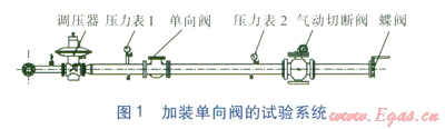 當(dāng)用戶(hù)用氣設(shè)備突然停機(jī),會(huì)造成調(diào)壓器出口管段內(nèi)壓力瞬間升高,其原因主要是用氣設(shè)備的切斷速度極快(切斷時(shí)間小于1s),而調(diào)壓器的閥口關(guān)閉速度慢(需3~4s),調(diào)壓器閥口關(guān)閉的響應(yīng)時(shí)間比用戶(hù)用氣設(shè)備切斷閥的切斷時(shí)間長(zhǎng),造成用戶(hù)用氣設(shè)備切斷后,調(diào)壓器上游還有少量氣體輸送至下游,造成下游管段壓力瞬間升高。如何抑制調(diào)壓器出口壓力的突然上升?本文從在調(diào)壓器出口管段上加裝單向閥、加裝安全放散閥以及調(diào)整用戶(hù)端用氣設(shè)備控制閥門(mén)的關(guān)閉程序等3個(gè)方面進(jìn)行試驗(yàn)研究。
