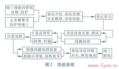 本工程開工后首先應進行施工場地內(nèi)管線改移、防護,進行止水帷幕及防護樁施工。本工程屬于深基坑工程,為保證施工過程中基坑(包括頂進工作坑和接收工作坑)的安全,必須確保防護樁的施工質(zhì)量。基坑防護樁完成后,進行基坑開挖、基底處理、安裝橫撐、安裝滑板。在基坑工程完成后,頂進施工前必須取得鐵路、市政、河道管理部門的同意,頂進施工前應到鐵路管理部門登記要點。登記要點后進行頂進設備的安裝調(diào)試和鐵路線路加固,然后開始頂進施工。為保證頂進方向的正確,在頂進圓管的同時進行檢測、糾偏,使頂進始終沿著正確的方向和高度進行。頂進就位后要在圓管與土體之間進行注漿加固,防止過大的沉降。待線路穩(wěn)定后拆除線路加固設備,同步拆除后背墻,設檢查井。經(jīng)驗收合格后對基坑分層回填、夯實,恢復地表。最后進行竣工驗收。頂進流程見圖2。