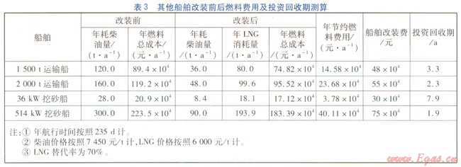 2000t級散貨船改裝前后的經(jīng)濟(jì)效益比較見表2(表2中的數(shù)據(jù)是實(shí)際運(yùn)行數(shù)據(jù)),其他幾種船舶改裝前后燃料費(fèi)用及投資回收期測算見表3。