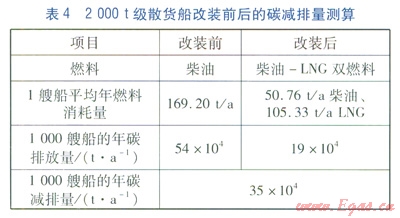 根據(jù)國家發(fā)改委提供的能源碳排放量計(jì)算方法,LNG與燃油的碳排放強(qiáng)度系數(shù)分別為0.27和3.18,即每消耗1kg LNG產(chǎn)生0.27kg的CO2,每消耗1kg燃油產(chǎn)生3.18kg的CO2,據(jù)此對2000t級散貨船改裝前后的碳減排量進(jìn)行測算比較,見表4。