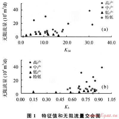 利用測井綜合特征參數(shù)及其交繪圖技術,可以對儲層和干層進行快速的分類或識別。儲層和干層特征值差別較大,在干層中,特征值K2、K3、K4、K5、K9-1、K10、K11、K13均為低值,受巖性及物性的影響K6值較高。