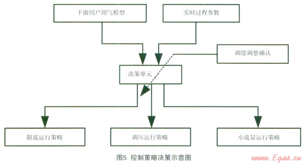 如圖5所示:通過天然氣用氣流量模型,預(yù)測下游用戶一天內(nèi)天然氣用量的流量-時間分布數(shù)據(jù),判斷出用氣高峰時段和低谷時段,同時結(jié)合實(shí)際運(yùn)行過程參數(shù)數(shù)據(jù),計算出相應(yīng)不同時段的運(yùn)行壓力數(shù)據(jù),在此基礎(chǔ)上調(diào)度人員根據(jù)經(jīng)驗(yàn)做出調(diào)整確認(rèn)后,下載到本地控制器中執(zhí)行具體的控制。