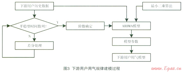 在短期預(yù)測建模過程中,常用的技術(shù)路線有:時間序列法、神經(jīng)網(wǎng)絡(luò)法、小波分析法等,但是在技術(shù)路線可執(zhí)行這個特點(diǎn)上,時間序列法更有優(yōu)勢。方案中采用的技術(shù)路線為:ARIMA建模。日用氣規(guī)律建模需要的數(shù)據(jù)有:出口壓力-時間,瞬時流量-時間的相關(guān)數(shù)據(jù)。