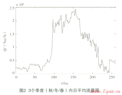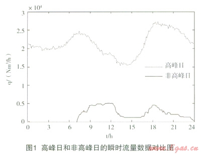 圖1表示:用氣高峰日和非高峰日內(nèi)下游用戶一天內(nèi)用氣量隨時間的變化過程;圖2表示:一年內(nèi)260天的日平均用氣量。從圖1和圖2中可以看出:高峰日和非高峰日,高峰時段和非高峰時段時,天然氣的流量變化范圍很大,在考慮性價比的情況下,實(shí)際流量計的選擇必須覆蓋流量上限。由此可能會出現(xiàn):在用氣量低谷時,實(shí)際運(yùn)行流量接近或低于流量計下限,從而引起流量的測量不準(zhǔn)確。