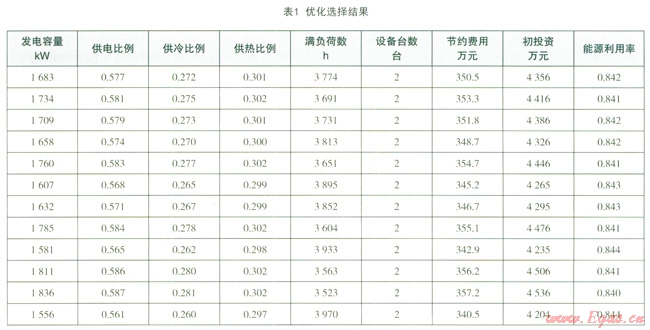 以10萬m2酒店建筑為例,采用分布式能源系統(tǒng)優(yōu)化計算軟件,綜合考慮能源利用效率、節(jié)約運行費用、初投資、機組滿負荷時數(shù)等因素后,得到的不同發(fā)電容量下的方案排序如表1所示。