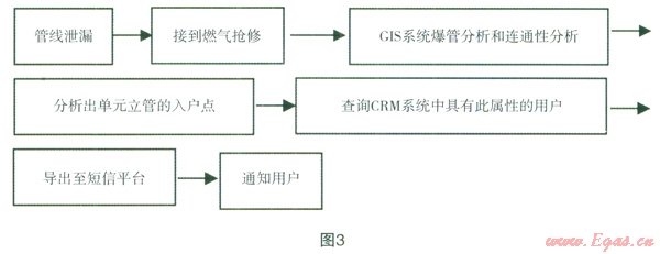 在GIS系統(tǒng)中,設(shè)置單元立管的入戶點(diǎn)為最小單元;在CRM系統(tǒng)中,增加燃?xì)庥脩羲鶎賳卧⒐苋霊酎c(diǎn)的屬性;當(dāng)出現(xiàn)燃?xì)夤艿佬孤屝迒栴}時(shí),可以通過GIS系統(tǒng)中的爆管分析和連通性分析,分析出泄漏點(diǎn)所影響的單元立管入戶點(diǎn),通過調(diào)用CRM系統(tǒng)中的具有此入戶點(diǎn)屬性的用戶,分析出所影響的用戶數(shù),并調(diào)用短信平臺(tái)接口將停氣通知實(shí)時(shí)發(fā)送至用戶手機(jī)中。此種方式,提高了影響范圍用戶的準(zhǔn)確性,并縮短了通知用戶的時(shí)間。具體的過程如圖3。