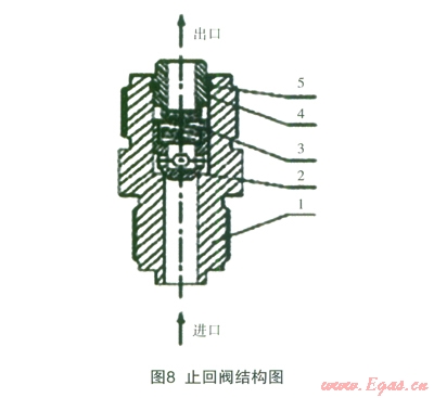 止回閥由閥體①、錐閥芯②、彈簧③、彈簧座③和擋圈⑤構(gòu)成(見圖8)。其工作原理是壓縮氣體進(jìn)入閥體,克服彈簧的彈簧力和摩擦力使止回閥開啟,壓縮氣體從進(jìn)口流入從出口流出,當(dāng)出口無壓縮氣體時(shí),在彈簧力和進(jìn)口(腔)余力作用下,閥口處于關(guān)閉狀態(tài),使從進(jìn)口到出口的氣體不流通。適用于只允許氣體向一個(gè)方向流動(dòng),即從進(jìn)口流入從出口流出,反過來則不可以。