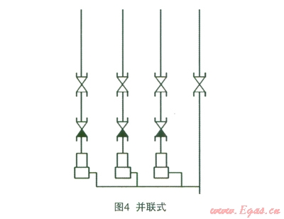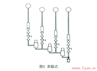 目前國(guó)產(chǎn)的優(yōu)先順序控制盤分為并聯(lián)式(見圖4)和串聯(lián)式(見圖5)兩種,均設(shè)高、中、低壓和直充功能,其核心部件也就是壓力保持閥和止回閥。串并聯(lián)的優(yōu)先順序控制盤均經(jīng)過壓力保持閥和止回閥改造實(shí)現(xiàn)儲(chǔ)氣井的天然氣回收。其不同的是,并聯(lián)式優(yōu)先順序控制盤在回收儲(chǔ)氣井(瓶)中的天然氣時(shí)可以對(duì)高、中和低壓其中之一進(jìn)行回收,互不影響,操作簡(jiǎn)單、方便;而串聯(lián)式則在回收任何一個(gè)儲(chǔ)氣井(瓶)時(shí)要對(duì)高、中和低壓三組壓力保持閥和止回閥同時(shí)進(jìn)行改造,相對(duì)就麻煩一些。