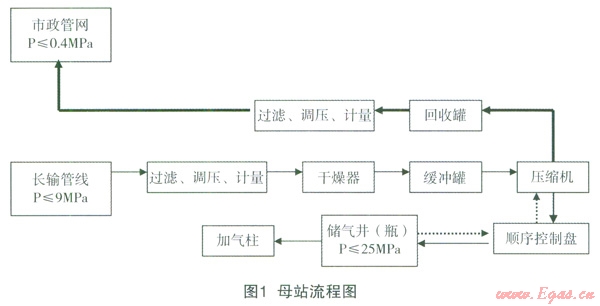 母站接收的天然氣,經(jīng)過加工,一部分加注燃?xì)廛囕v,一部分進(jìn)入市政管網(wǎng),形成了兩個(gè)供氣路徑。其中,儲(chǔ)氣井的氣可以通過順序控制盤、壓縮機(jī),經(jīng)過過濾、調(diào)壓、計(jì)量,進(jìn)入市政管網(wǎng)(見圖l)。