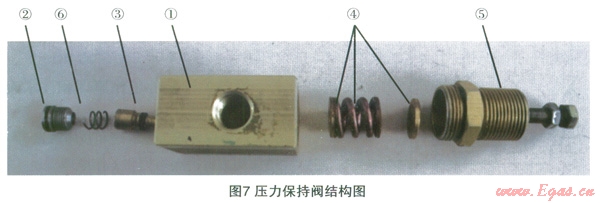 壓力保持閥由閥體(進(jìn)出口)①、閥芯組件②③、彈簧組件④和調(diào)壓閥體⑤構(gòu)成,用于保持壓縮機(jī)在不低于一定壓力的情況下工作的重要部件。其工作原理是氣體從|礙體進(jìn)口流入,經(jīng)過閥芯,通過壓力推動(dòng)閥芯,克服彈簧組件的彈簧力和摩擦力,擠壓彈簧,使氣體從閥芯和彈簧組件密封的閥體中流出。調(diào)節(jié)閥體則是用于調(diào)節(jié)壓力保持閥額定壓力的元件,即調(diào)節(jié)彈簧組件的松緊度(見圖7)。