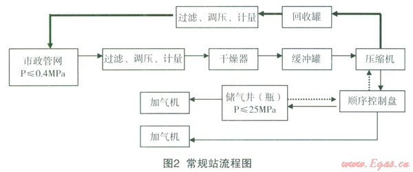接通市政管網(wǎng)是常規(guī)加氣站一個(gè)顯著的特征。儲(chǔ)氣井(瓶)中的天然氣回收從儲(chǔ)氣井(瓶)開始,流經(jīng)順序控制盤、壓縮機(jī)到回收罐,最后經(jīng)過過濾、調(diào)壓、計(jì)量進(jìn)入市政管網(wǎng),形成了一個(gè)供氣回路(見圖2)。