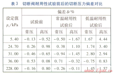 表3是5組不同廠(chǎng)家、不同型號(hào)切斷閥常溫耐用性試驗(yàn)和低溫耐用性試驗(yàn)(低溫試驗(yàn)條件為-20℃)前后的實(shí)際切斷壓力與切斷壓力設(shè)定值的偏差對(duì)比。