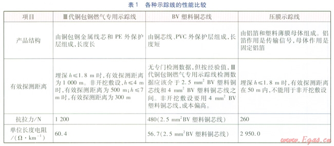 ①摒棄壓膜示蹤線之后,目前較多選用BV塑料銅芯線作為示蹤線代用產(chǎn)品,但因其是非專業(yè)產(chǎn)品,存在成本高、抗腐蝕和抗老化性能差、抗拉力有局限性、長(zhǎng)度短致使接頭增多等缺陷。筆者建議可改用Ⅲ代銅包鋼燃?xì)鈱S檬聚櫨€,兇其具有電阻小、抗拉強(qiáng)度高、抗腐蝕和抗老化性能好、長(zhǎng)度長(zhǎng)可減少接頭、連接處有專用連接防護(hù)接頭等優(yōu)勢(shì),可滿足水平定向鉆敷設(shè)PE燃?xì)夤艿缹?duì)示蹤線的要求。根據(jù)中山順康塑料制品公司提供的數(shù)據(jù),對(duì)幾種示 蹤線進(jìn)行性能比較,見(jiàn)表1。