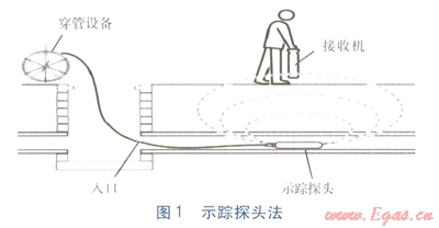 從以上論述可知,雖然對(duì)常規(guī)示蹤線探測(cè)技術(shù)采取了相應(yīng)改進(jìn)措施,但是由于常規(guī)示蹤線探測(cè)技術(shù)存在易受干擾等諸多瓶頸問(wèn)題,因此筆者認(rèn)為僅靠該方法對(duì)水平定向鉆進(jìn)敷設(shè)PE管道進(jìn)行定位存在不足及風(fēng)險(xiǎn),致使出現(xiàn)竣工后實(shí)際管道無(wú)法探測(cè)的失敗案例也很正常。因此,尋求一種更為穩(wěn)妥的適合于水平定向鉆進(jìn)敷設(shè)的PE管道(以下簡(jiǎn)稱拉管管道)定位方法是本文致力探索的方向。筆者就數(shù)年實(shí)踐經(jīng)驗(yàn)及查閱文獻(xiàn),推薦由鉆頭軌跡法、示蹤探頭法、常規(guī)示蹤線法三管齊下的準(zhǔn)確定位方法,可較好地解決水平定向鉆敷設(shè)PE管道的定位問(wèn)題。
