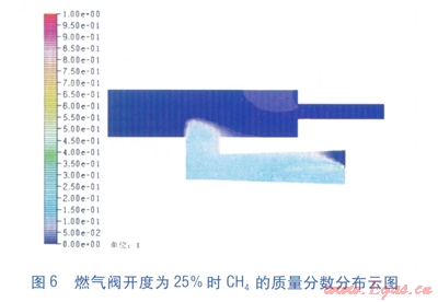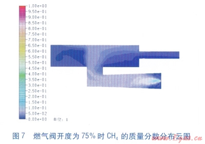 圖6、7為沿爐腔排氣導管軸線縱截面(即y=0平面)內(nèi)CH4的質(zhì)量分數(shù)分布云圖,單位為l。當燃氣閥開度為25%時,燃氣噴射速度較低,引射管內(nèi)CH4的質(zhì)量分數(shù)較大,說明燃氣得以在引射管內(nèi)和空氣預混充分,然后進入爐腔內(nèi)點火燃燒。當燃氣閥開度為75%時,燃氣噴射速度較高,引射管內(nèi)CH4的質(zhì)量分數(shù)比燃氣閥開度為25%狀態(tài)低了很多。