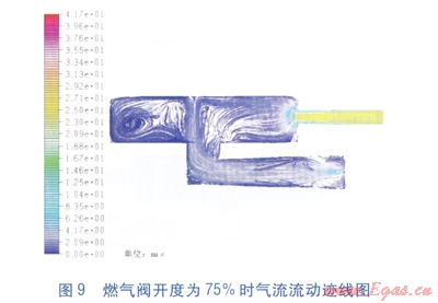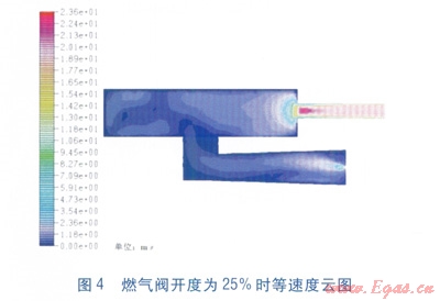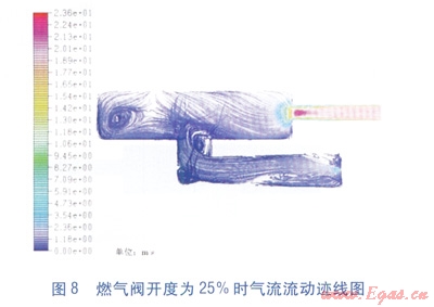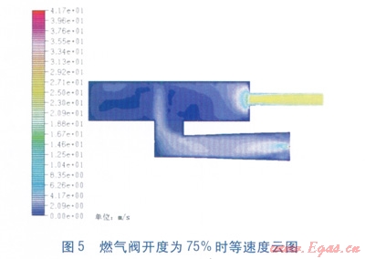 利用FLUENT軟件對比模擬了燃氣閥開度為25%和75%兩種條件下爐腔內(nèi)的氣體流動狀態(tài)。計算得出兩種狀態(tài)下整個爐腔內(nèi)氣流的最高流速分別為24.61m/s和46.86m/s。高速流主要出現(xiàn)在爐腔排氣導管。
