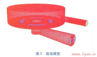 將在GAMBIT下建立的網(wǎng)格模型導入FLUENT中,得到如圖3所示的流場模型。因流場中氣體的流動速度不高,可將模型視為一個定常不可壓縮流體的層流穩(wěn)態(tài)求解問題。采用FLUENT軟件缺省的分離求解器。操作環(huán)境設置在一個標準大氣壓下,考慮2軸負方向的重力加速度,在設置邊界值時充分利用樣機試驗過程中所獲得的參數(shù)(如表l所示),運用層流計算狀態(tài)下的組分輸運模型,假設試驗中的家用天然氣只含有CH4組分,并基于非結(jié)構(gòu)化網(wǎng)格下的SIMPLE算法對整個模型進行模擬分析。