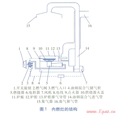 內(nèi)燃灶的結(jié)構(gòu)見圖l。工作時,空氣連同炊事產(chǎn)生的油煙、水蒸氣通過風機壓送到封閉的爐腔內(nèi),燃氣在自身壓力作用下進入燃燒器,并在高于大氣壓的條件下燃燒,加熱爐板,爐板可直接加熱食物或其他烹飪炊具;高溫廢氣在排出的過程中加熱油煙混合氣進氣管內(nèi)的氣體,減少廢氣余熱的浪費,提高系統(tǒng)熱效率[5]。