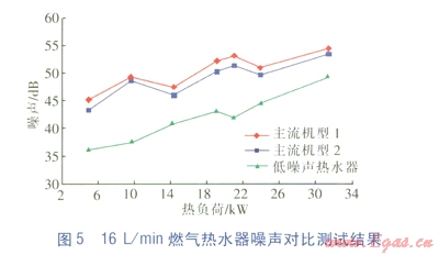 由圖5可知,當(dāng)熱負(fù)荷在24kW以下時(shí),l6L/min的低噪聲熱水器的噪聲比主流機(jī)型低10dB以上;最大熱負(fù)荷時(shí),低4dB以上。