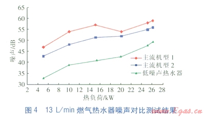 由圖4可知,當(dāng)熱負(fù)荷在21kW以下時(shí),l3L/min的低噪聲熱水器的噪聲比主流機(jī)型低10dB以上;最大熱負(fù)荷時(shí),低6dB以上。