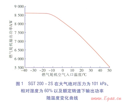 溫度升高、濕度增大固然會降低燃?xì)廨啓C(jī)的輸出功率,但是根據(jù)SGT200-2S燃?xì)廨啓C(jī)性能曲線,其設(shè)計(jì)功率能夠滿足當(dāng)?shù)馗鱾€溫度下制冷劑壓縮機(jī)的功耗要求。SGT200-2S在大氣絕對壓力為l01kPa、相對濕度為60%的設(shè)定狀況以及額定轉(zhuǎn)速下輸出功率隨溫度的變化曲線見圖l。從圖1中可以看出,即使在40℃下理論上燃?xì)廨啓C(jī)輸出功率仍能滿足制冷劑壓縮機(jī)的功耗要求。該廠所處地區(qū)夏季平均環(huán)境溫度為32.7℃,低于40℃;該地區(qū)夏季相對濕度為80%,高于燃?xì)廨啓C(jī)設(shè)定狀況下的相對濕度,可能會造成燃?xì)廨啓C(jī)輸出功率有所降低,但影響效果應(yīng)該較小[1]。