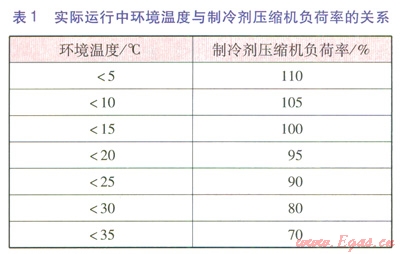 針對燃?xì)廨啓C(jī)高溫情況下易跳車的故障表現(xiàn),該工廠擬采用降低空氣入口溫度的方法解決跳車問題。其方案可行性研究報告認(rèn)為,工廠夏季平均環(huán)境溫度高達(dá)30℃,相對濕度為70%~80%,溫度高、濕度大是造成燃?xì)廨啓C(jī)輸出功率不足的主要原因。燃?xì)廨啓C(jī)額定輸出功率為7.65MW,制冷劑壓縮機(jī)設(shè)計(jì)輸入功率為6.13MW,理論上燃?xì)廨啓C(jī)應(yīng)能滿足制冷劑壓縮機(jī)滿負(fù)荷下的功率要求。但在實(shí)際運(yùn)行過程中,按照制冷劑壓縮機(jī)功率計(jì)算,夏季負(fù)荷率最高只能維持在80%左右,相當(dāng)于燃?xì)廨啓C(jī)在該環(huán)境溫度下的輸出功率僅有4.9MW左右,遠(yuǎn)低于燃?xì)廨啓C(jī)的額定輸出功率。該廠技術(shù)人員總結(jié)實(shí)際運(yùn)行經(jīng)驗(yàn),發(fā)現(xiàn)實(shí)際運(yùn)行中環(huán)境溫度與制冷劑壓縮機(jī)負(fù)荷率的關(guān)系見表l。