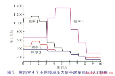 燃燒室4個不同頻率壓力信號跳車前后10s數(shù)據(jù)如圖5所示,這4個壓力信號表征燃燒室火焰振蕩特征頻段的強(qiáng)度。頻率l、頻率2、頻率3、頻率4代表頻率依次降低。從圖5可以看出,在2s左右,高頻段頻率1、頻率2的值突降,圖3和圖4中7號燃燒室的溫度也突然降低;3s左右,高頻段強(qiáng)度進(jìn)一步降低,低頻段信號頻率4突然增強(qiáng),7號燃燒室的溫度也再次下降;4s左右,這一趨勢進(jìn)一步加強(qiáng),7號燃燒室溫度也進(jìn)一步降低;6s以后,所有頻段的信號強(qiáng)度都減弱,這是因?yàn)橹?、輔燃料閥都已經(jīng)關(guān)小,燃燒室功率下降。從以上變化趨勢可以看出,火焰高頻振動減弱、低頻振動加強(qiáng)代表燃燒不穩(wěn)定的增強(qiáng),最后導(dǎo)致火焰被吹滅,燃燒室溫度下降。該廠現(xiàn)場操作人員也反映,燃?xì)廨啓C(jī)運(yùn)行過程中除了正常的運(yùn)行噪聲外,還有周期性的轟隆聲,這些外部表現(xiàn)與燃?xì)廨啓C(jī)熱聲振蕩燃燒現(xiàn)象非常相似。周期性的燃燒不穩(wěn)定,并且出現(xiàn)較大振幅的壓力波動,這種現(xiàn)象通常稱為熱聲振蕩燃燒。