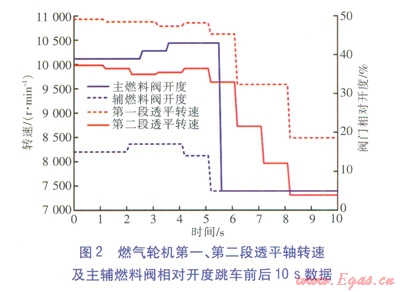 SGT200-2S燃?xì)廨啓C(jī)為雙軸燃?xì)廨啓C(jī),燃?xì)廨啓C(jī)第一、第二段透平軸轉(zhuǎn)速及主輔燃料閥相對開度跳車前后l0s數(shù)據(jù)如圖2所示,左側(cè)縱坐標(biāo)表示燃?xì)廨啓C(jī)透平轉(zhuǎn)速,右側(cè)縱坐標(biāo)表示主輔燃料閥相對開度。