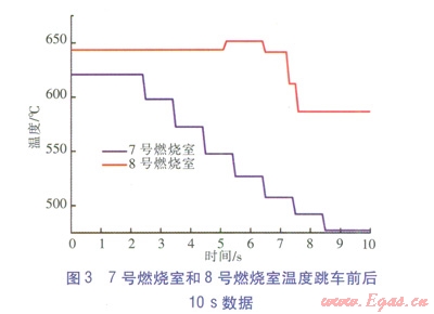 SGT-200-2S燃?xì)廨啓C(jī)有8個燃燒室,每個燃燒室都設(shè)置了測溫?zé)犭娕迹?span lang="EN-US">7號燃燒室和8號燃燒室跳車前后10s數(shù)據(jù)如圖3所示,其他燃燒室溫度變化情況與8號燃燒室情況類似。