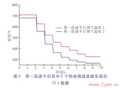 燃?xì)廨啓C(jī)第一段透平后設(shè)置了16個測溫?zé)犭娕?,其?span lang="EN-US">2個熱電偶跳車前后l0s數(shù)據(jù)如圖4所示,根據(jù)熱電偶測點(diǎn)位置可以確定這兩個熱電偶測得的是7號燃燒室后的煙氣溫度。圖4中的數(shù)據(jù)顯示第一級透平后的溫度甚至高于圖3中燃燒室的溫度,這是因?yàn)閳D3中顯示的燃燒室溫度并不是透平進(jìn)口初溫(該溫度通常為ll00℃以上),而是實(shí)際燃燒室內(nèi)熱電偶布點(diǎn)處的溫度,由于燃燒室溫度并不是均勻的,該熱電偶所處位置溫度較低。