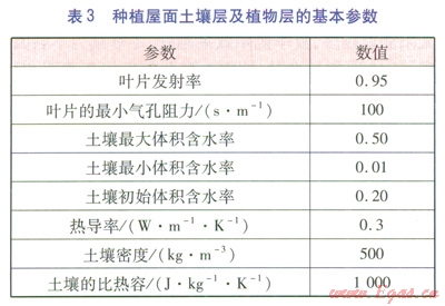 屋面的生態(tài)環(huán)境與地面明顯不同,受屋面自然條件的限制,太陽輻射、溫度、濕度、風力等隨著層高的增加而呈現(xiàn)不同的變化,因此屋面的參數(shù)優(yōu)化選取至關(guān)重要。種植屋面通過遮陽作用、熱阻、蒸騰蒸發(fā)作用來實現(xiàn)節(jié)能的效果。葉面積指數(shù)(簡稱LAI,是指單位土地面積上植物葉片總面積與土地面積之比,是一個無因次量)和植物高度影響植物的遮陽作用,屋面構(gòu)造和土壤參數(shù)影響種植屋面的熱阻,土壤含水率和植物種類及特征影響蒸騰蒸發(fā)作用。
