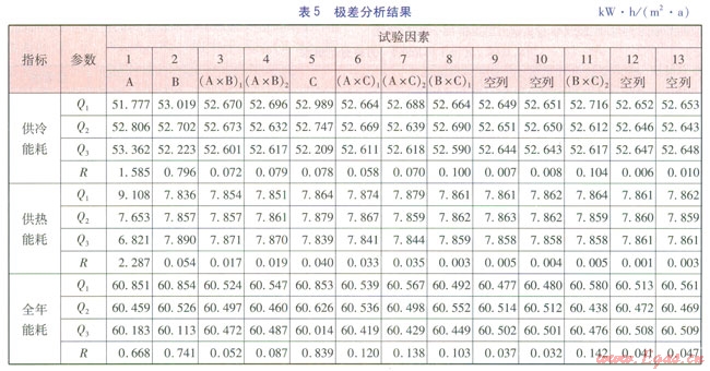 極差法可以簡單、快捷地確定各因素對指標影響的主次順序,方差分析法利用F檢驗可以考察正交試驗因素對指標的影響是否顯著。因此,本文結(jié)合極差法和方差分析法對試驗結(jié)果進行分析,得到種植屋面能耗影響因素的主次順序,并差別各個因素的顯著性,通過直觀分析綜合比較,確定最優(yōu)試驗方案。