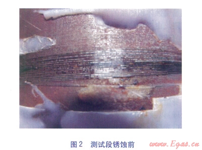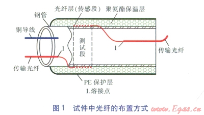 試件為一段長度為200mm的鋼管(材質(zhì)為Q235),對銹蝕測試段外壁進(jìn)行拋光處理,拋光后測試段外直徑為73.8mm,壁厚為3.5m。試件中光纖的布置方式見圖l。在距鋼管端面50mm處纏繞光纖層(傳感段),纏繞時(shí)使光纖帶有一定的預(yù)應(yīng)力,保證光纖與鋼管表面緊密接觸,纏繞的光纖總長度在4m左右。將光纖用環(huán)氧樹脂膠固定在鋼管上,傳感段的引出端與帶保護(hù)套的傳輸光纜熔接,將熔接處進(jìn)行保護(hù)處理,并在鋼管兩端的引出位置用環(huán)氧樹脂膠進(jìn)行固定。光纖設(shè)置完畢后,在鋼管與PE保護(hù)管間進(jìn)行發(fā)泡處理。
