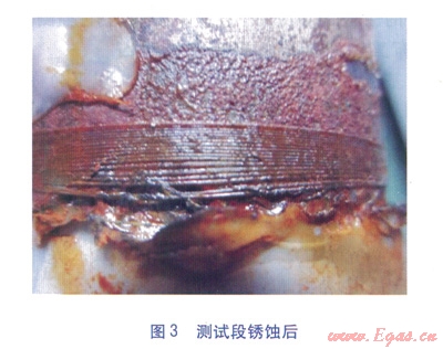 在電化學(xué)加速銹蝕的情況下,試件經(jīng)過2d持續(xù)腐蝕后,布里淵分析儀基本監(jiān)測不到應(yīng)變的變化,此時(shí)停止試驗(yàn)。測試段銹蝕前后的情況分別見圖2、3。