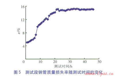 由測試結(jié)果可知,發(fā)生銹蝕前測試段外直徑D1為73.8mm,電化學(xué)加速銹蝕結(jié)束后測試段鋼管不包含銹蝕層的外直徑D1為72.8mm,代入式(2)可計(jì)算得到電化學(xué)加速銹蝕結(jié)束后測試段鋼管質(zhì)量損失率e為0.149,此時(shí)傳感段光纖的應(yīng)變?yōu)?span lang="EN-US">2161.0×10-6。由式(7)可計(jì)算得到,由銹蝕導(dǎo)致的測試段體積膨脹率h為l.16。設(shè)定在鋼管發(fā)生銹蝕后h保持不變,則可由布里淵分析儀讀取的傳感段光纖應(yīng)變及式(7)計(jì)算得到各時(shí)刻測試段鋼管質(zhì)量損失率。測試段鋼管質(zhì)量損失率隨測試時(shí)間的變化見圖5。