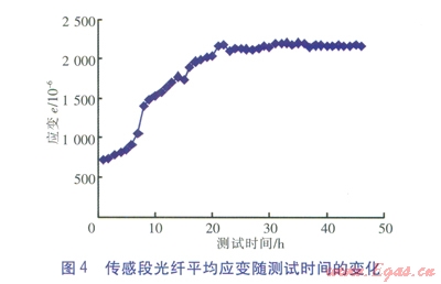 將5個(gè)連續(xù)有效測點(diǎn)的光纖平均應(yīng)變作為傳感段光纖平均應(yīng)變,傳感段光纖平均應(yīng)變隨測試時(shí)間的變化見圖4。